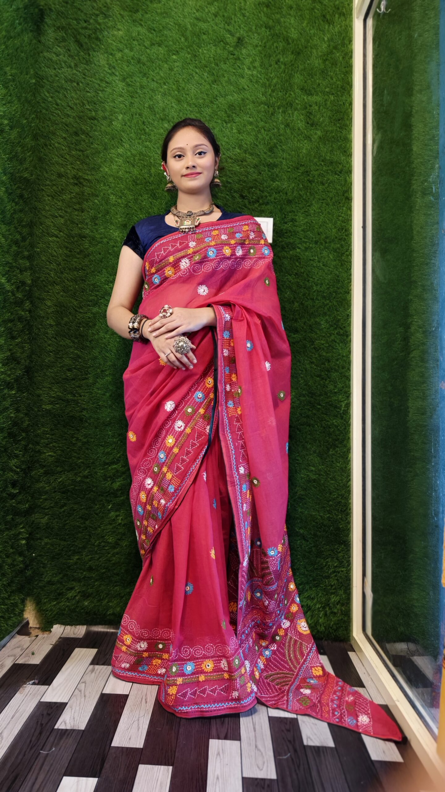 Additional ChargesBeautiful pink saree with gujrati hand stitch embroidery with blue hand work blouse
